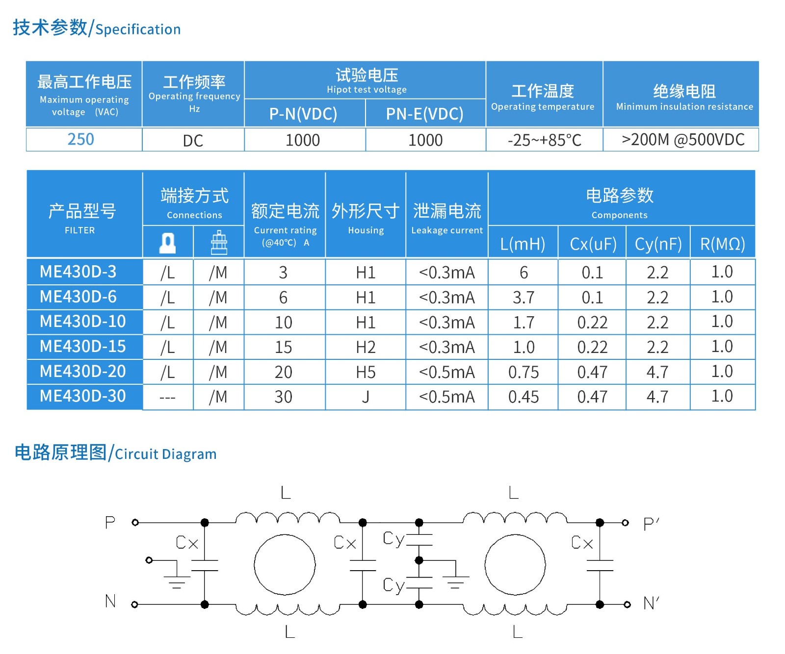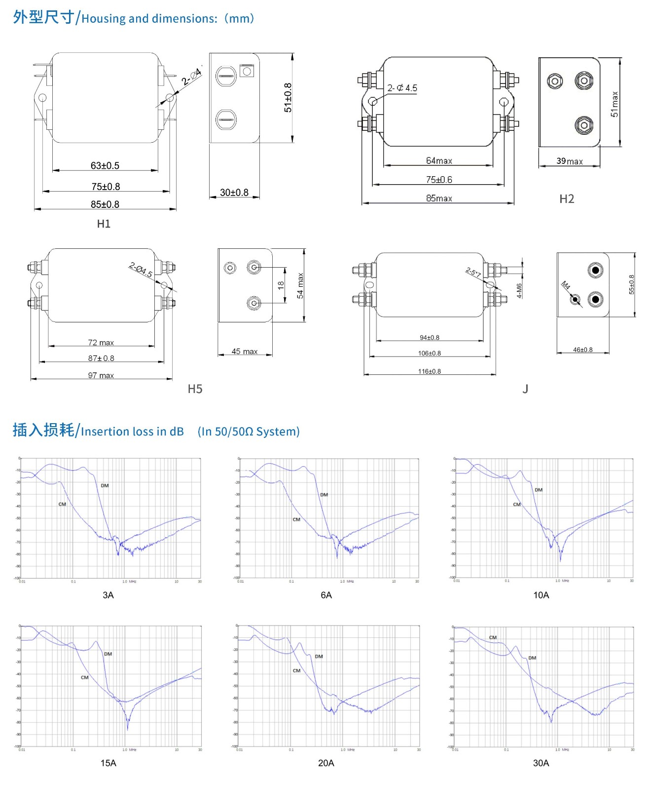 专为抑制直流电源线上的噪声设计,双节滤波器 ,优良的低频、高频滤波效果。