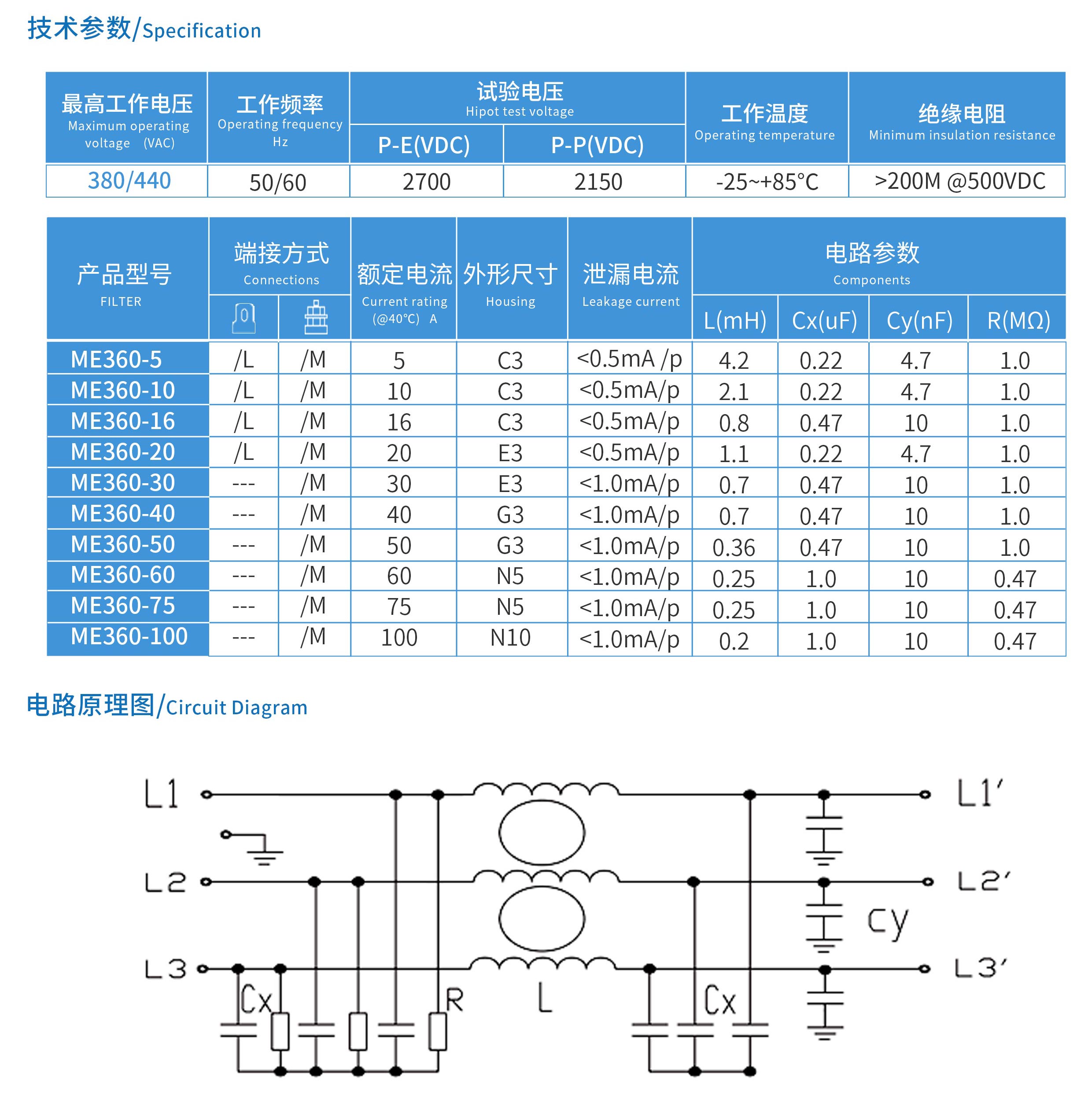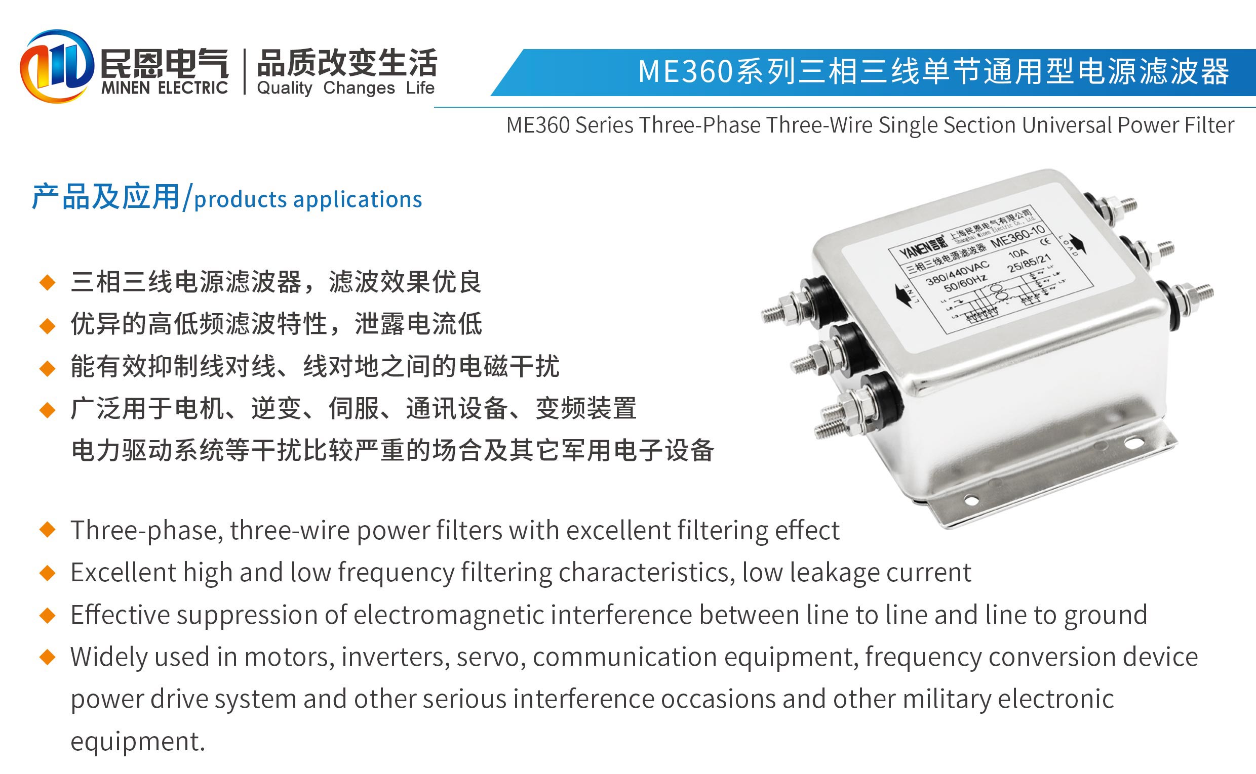 三相三线电源滤波器,滤波效果优良,优异的高低频滤波特性,泄露电流低,能有效抑制线对线、线对地之间的电磁干扰