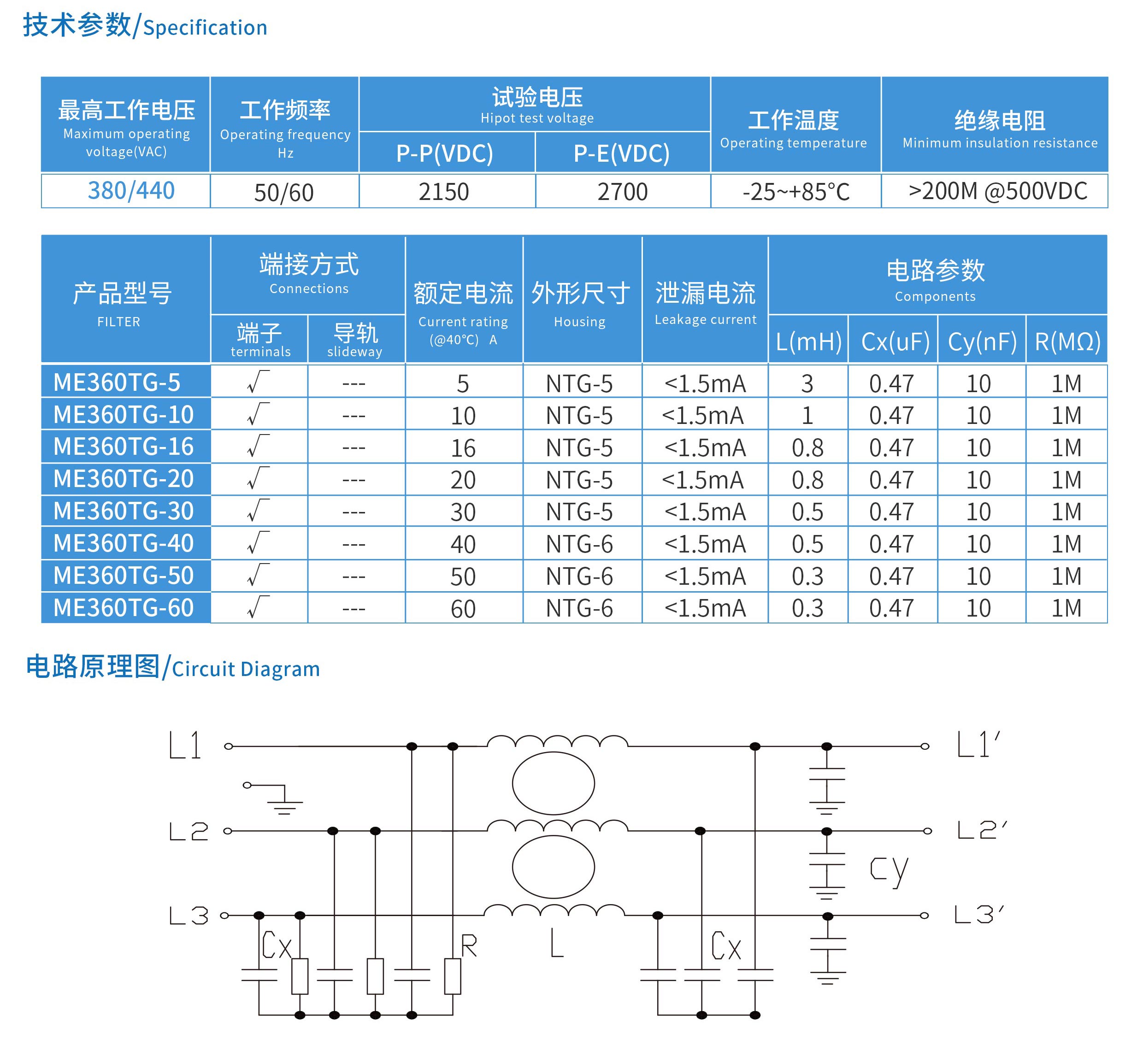 三相三线电源滤波器,滤波效果优良,优异的高低频滤波特性,泄露电流低,端子导轨式滤波器