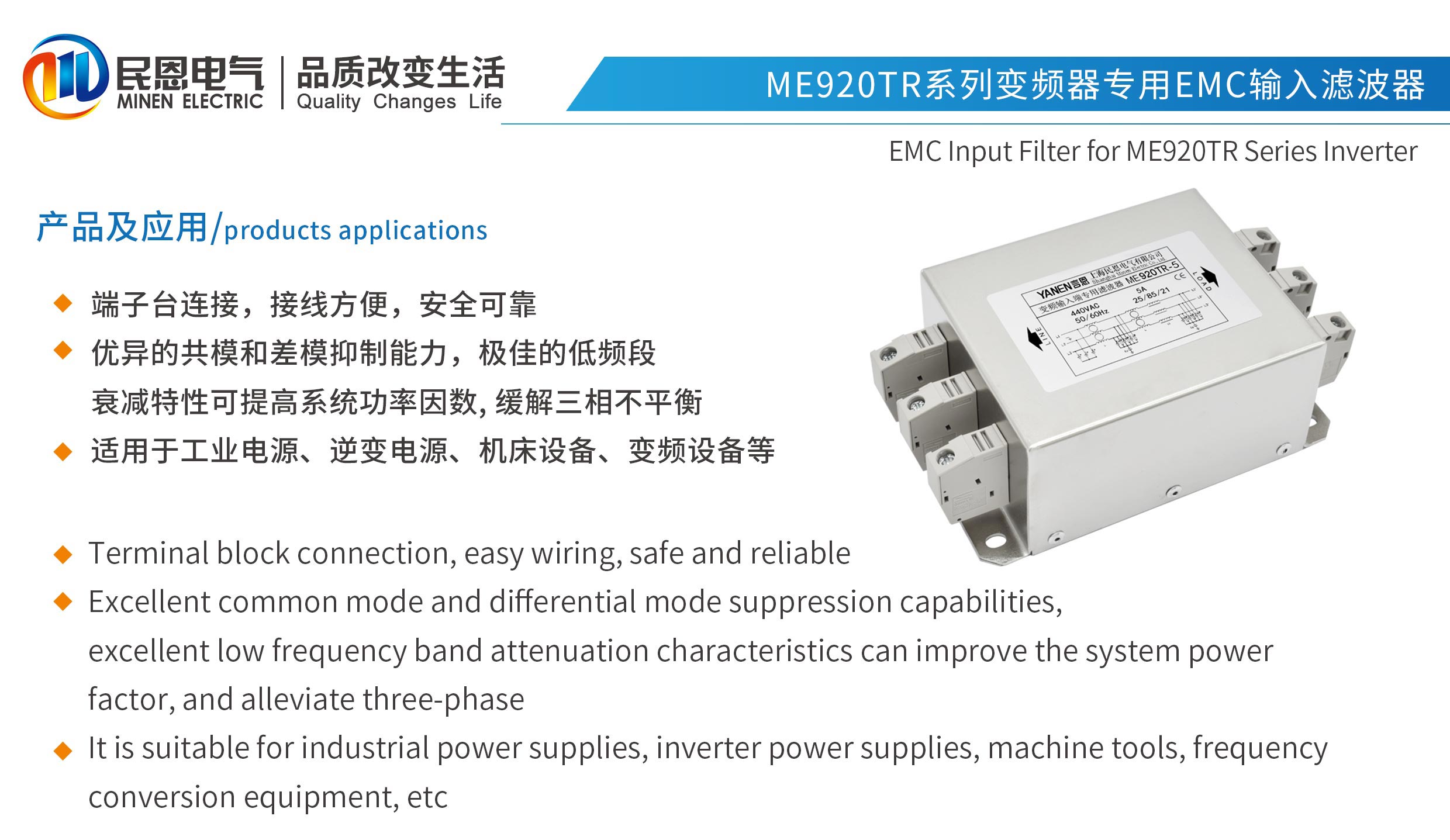 基于变频器工作时输入端对电网及PLC、DCS系统等数字设备产生干扰的领域而专门设计。较好的共模和差模抑制能力,可有效抑制变频器、伺服驱动器等设备对外界的传导干扰,保证周边设备的正常运行;标准匹配国内外多种低压变频器。