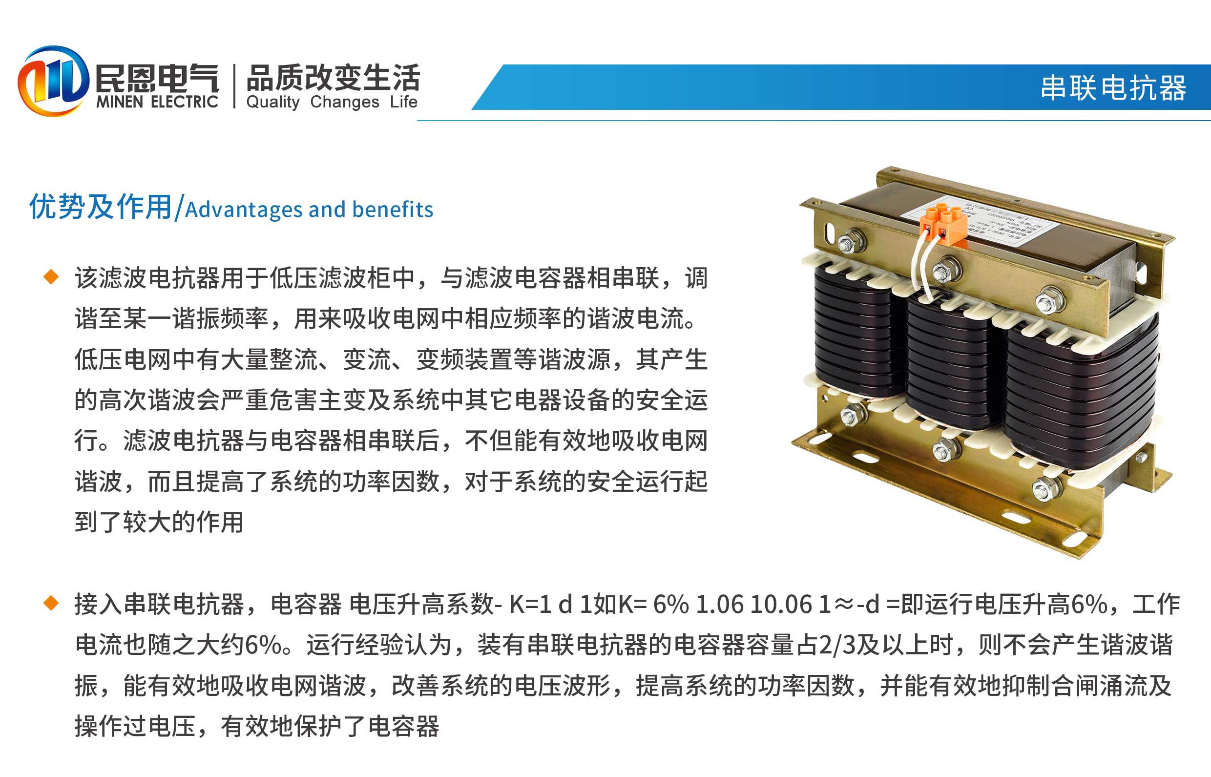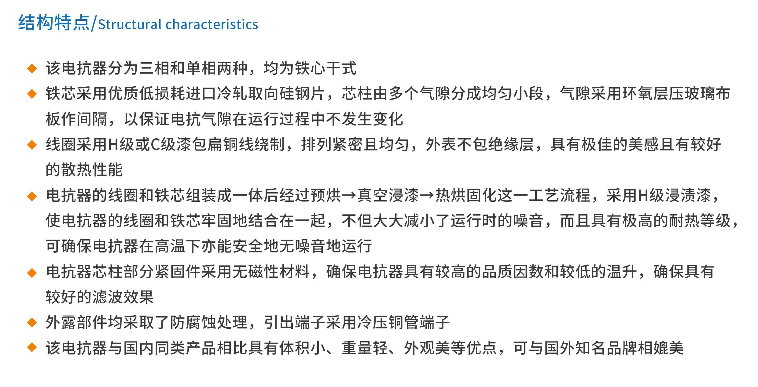 该系列干式铁芯单相串联电抗器用于低压无功补偿柜中,与单相电容器相串联。 当低压电网中有大量整流、变流装置等谐波源时,其产生的高次谐波会严重危害主变及其它电器设备的安全运行。电抗器与电容器相串联后,能有效地抑制电网谐波,改善系统的电压波形,提高系统的功率因数,并能有效地减小合闸涌流及操作过电压,保证了电容器的安全运行。铁心采用优质低损耗冷轧硅钢片,铁心柱由多个气隙分成均匀小段气隙采用环氧层压玻璃布板作间隔,气隙间及铁饼与铁轭间采用耐高温高强度粘接剂粘接,以保证电抗气隙在运行过程中不发生变化,同时有效减少铁芯饼之间的震动,从而降低噪升。线圈采用F/H级漆包铜扁线或漆包铝扁线绕制,排列紧密且均匀,有较好的散热性能。电抗器的线圈和铁芯组装成一体后经过预烘→真空浸漆一热烘固化这一工艺流程,采用F/H级浸溃漆,使电抗器的线圈和铁芯丰固地结合在一起,不但减小了运行时的噪声,而且具有极高的耐热等级,可确保电抗器在高温下亦能安全低噪音地运行。