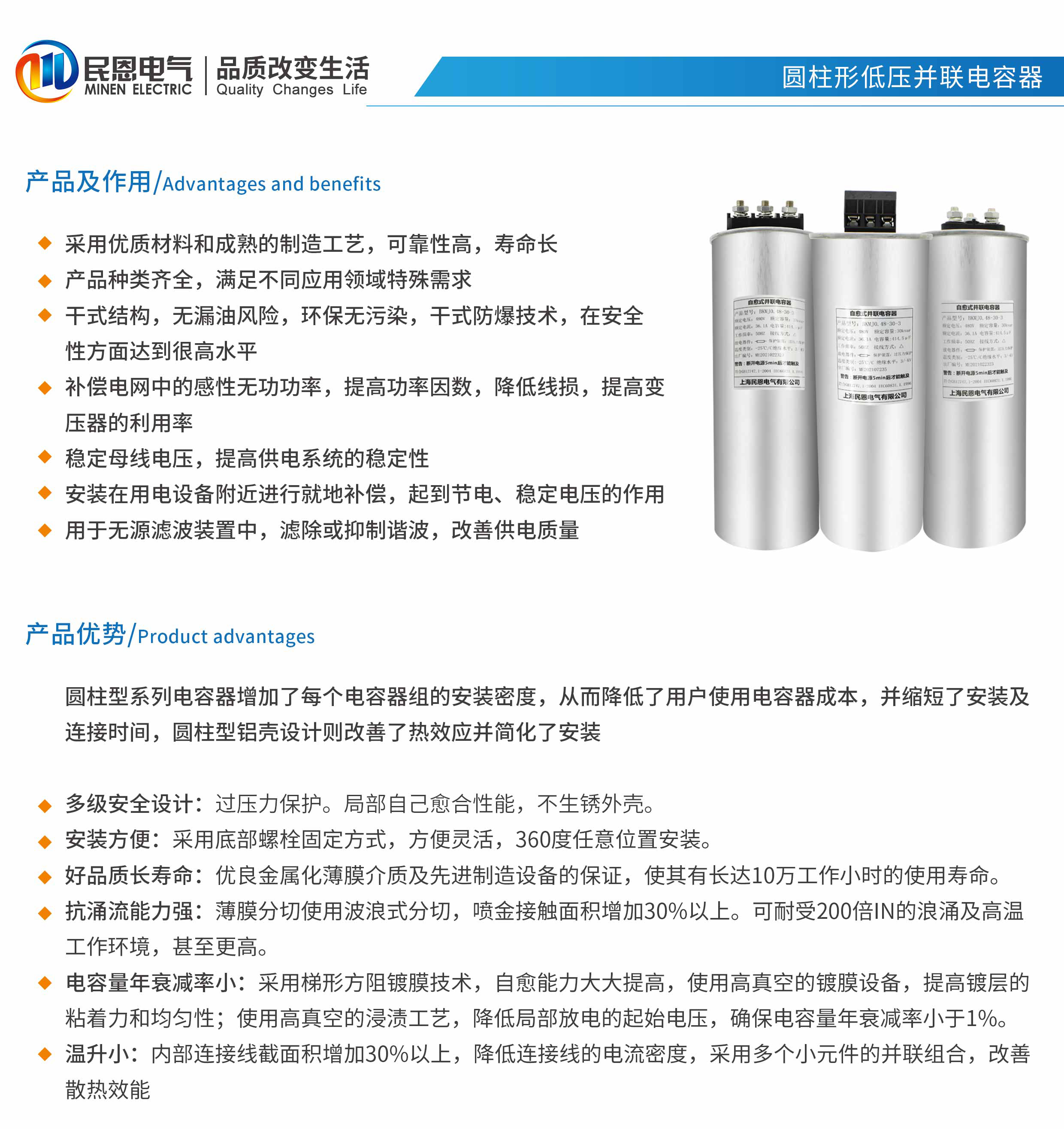 电容器内部集成了三相分别独立的单元,每个单元采用经金属化处理的聚丙烯薄膜为绝缘材质特殊的薄膜镀层设计及边缘加强设计,使电容器具有良好的自愈能力和抑制大电流能力。 创新的真空灌注技术,可保证电容器具有良好的热稳定性及散热性。 电容器在承受过电压或临近使用寿命时,电容器内部元件不断发生击穿-自愈循环直至元件破坏,这一过程将导致电容器内部压力不断增加,为了防止不断增加的压力导致电容器壳体发生破裂,电容器内部安装了过压力保护装置通过释放内部压力使端盖与元件之间的连接断开阻止电流流过,从而防止电容器由干过载或过热引起的爆炸。 电容器内置放电电阻,使电容器在离网后能够自行放电,确保人身安全
