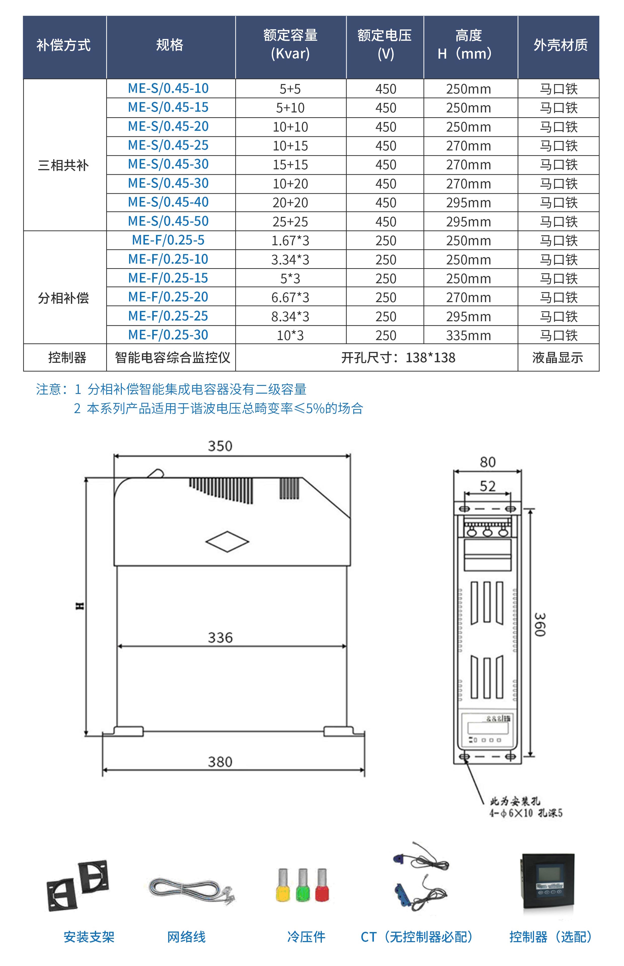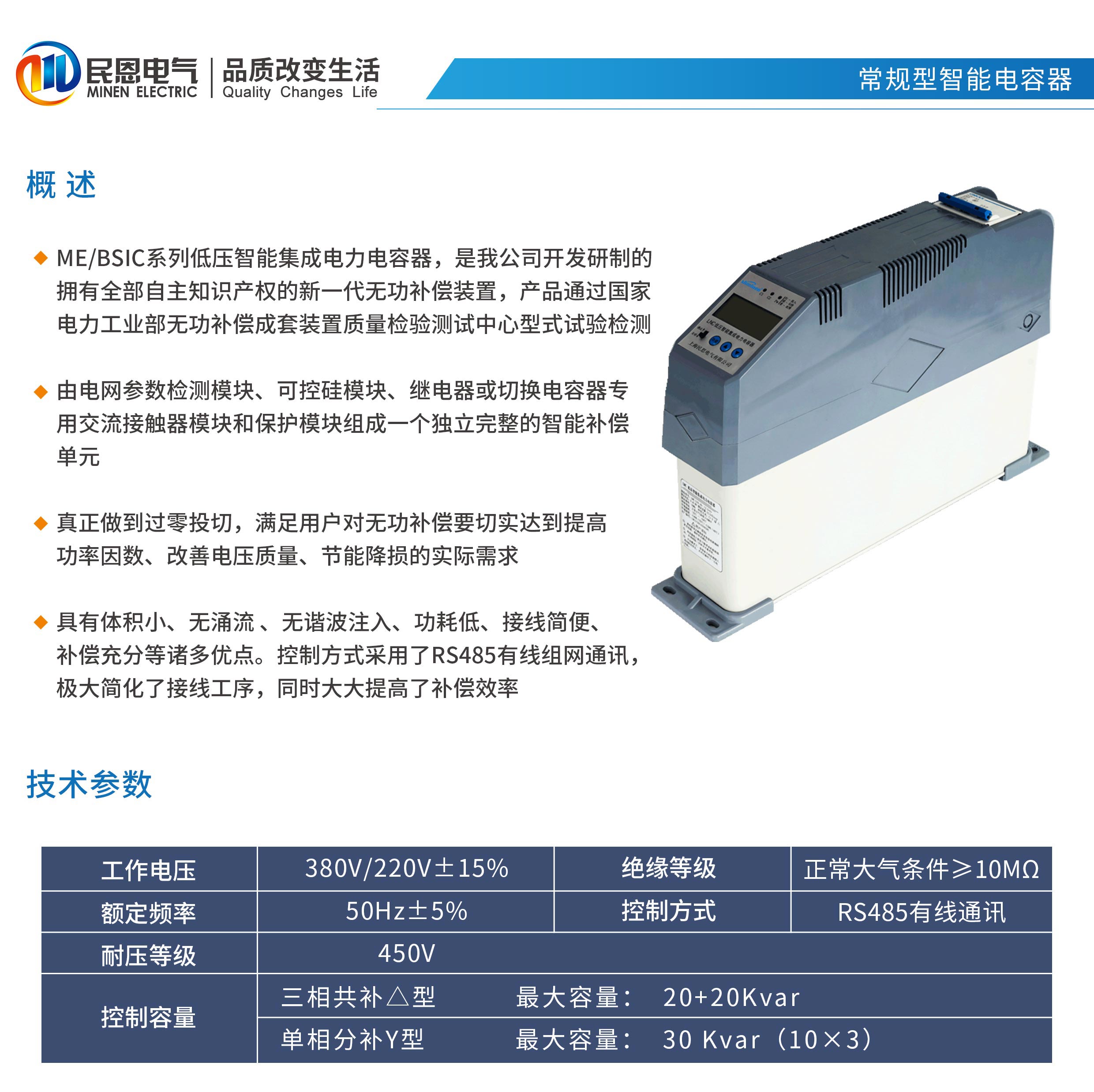 低压智能集成电力电容器,是我公司开发研制的拥有全部自主知识产权的新一代无功补偿装置,产品通过国家电力工业部无功补偿成套装置质量检验测试中心型式试验检测。 产品由电网参数检测模块、可控硅模块、继电器或切换电容器专用交流接触器模块和保护模块组成一个独立完整的智能补偿单元。真正做到过零投切,满足用户对无功补偿要切实达到提高功率因数、改善电压质量、节能降损的实际需求。具有体积小、无涌流 、无谐波注入、功耗低、接线简便、补偿充分等诸多优点。控制方式采用了RS485有线组网通讯,极大简化了接线工序,同时大大提高了补偿效率。