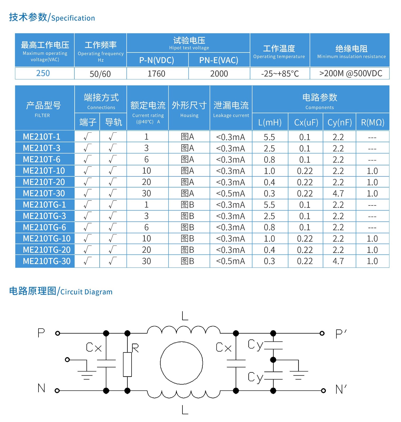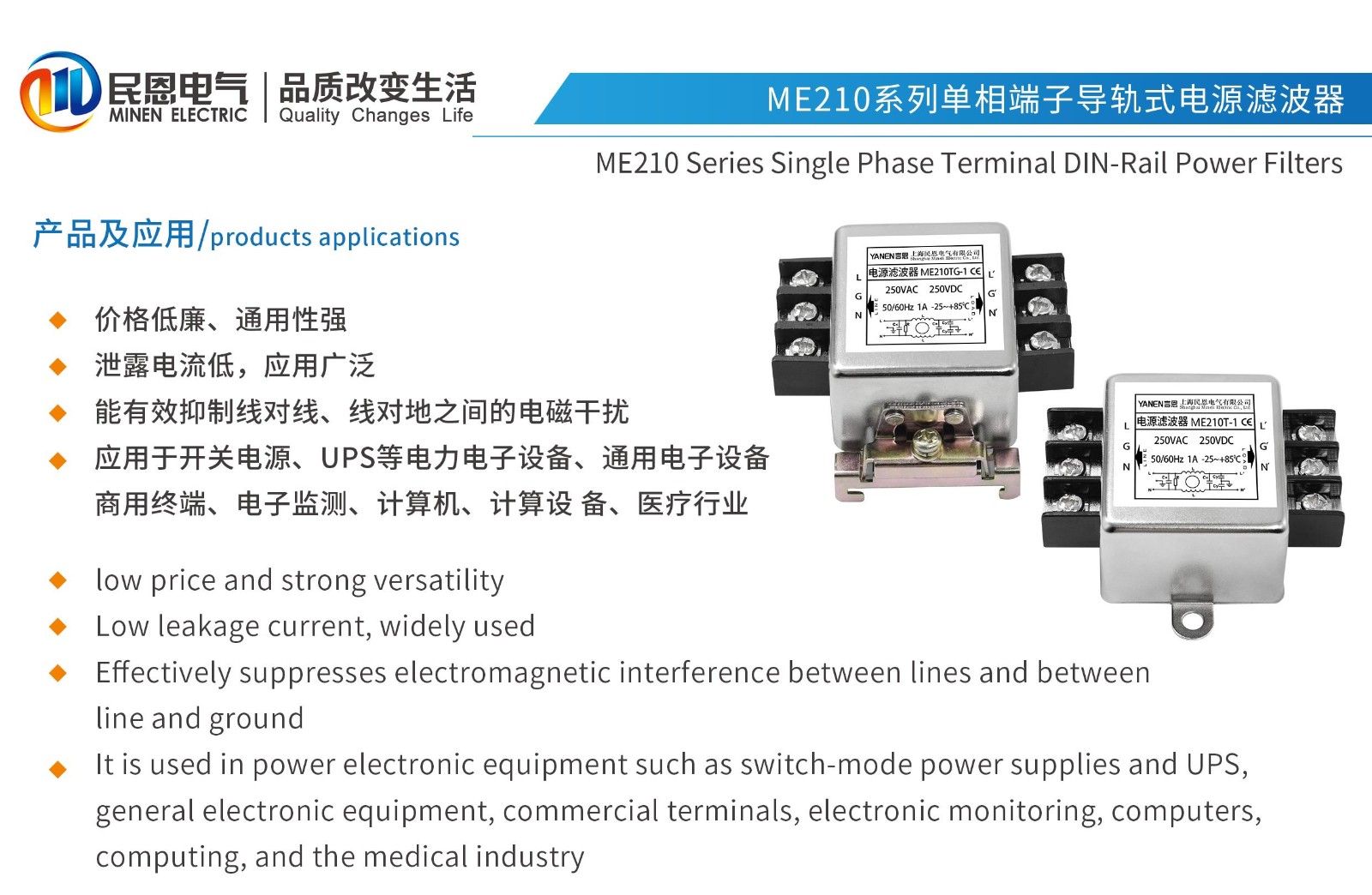 ME210T系列单相端子式电源滤波器